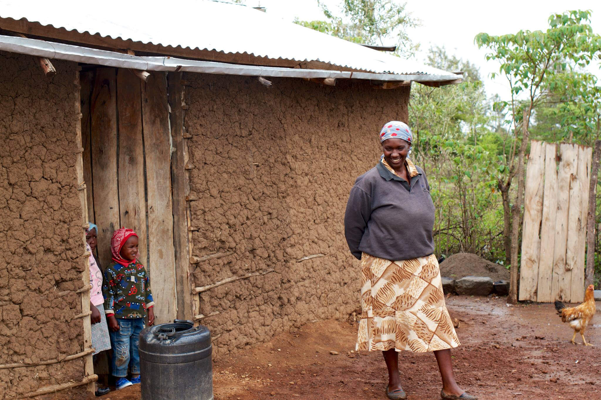 Mama Treasia outside her home - warning her young ones not to get their new shoes dirty on a rainy afternoon.